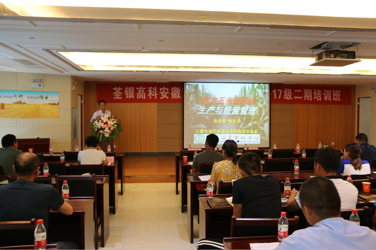 ??? 2018年7月19日,由安徽省農(nóng)委主辦、荃銀高科承辦的安徽現(xiàn)代青年農(nóng)場(chǎng)主培訓(xùn)2017級(jí)第二期培訓(xùn)活動(dòng)在公司六樓多功能廳展開(kāi)。安徽荃銀高科董事長(zhǎng)張琴、營(yíng)銷(xiāo)總監(jiān)王玉林,培訓(xùn)班總教務(wù)長(zhǎng)楊惠成老師,安徽張海銀基金會(huì)秘書(shū)長(zhǎng)張彤,及來(lái)自全省各地的100多位從事種植業(yè)的農(nóng)場(chǎng)主學(xué)員參加了培訓(xùn)。