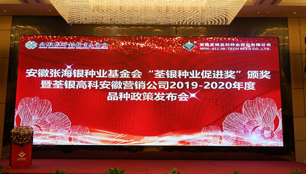 ??? 深耕種業(yè),不忘初心。8月19-20日,安徽張海銀種業(yè)基金會2019年“荃銀種業(yè)促進獎”頒獎大會暨荃銀高科安徽營銷公司品種政策發(fā)布會在安徽蕪湖隆重召開。安徽省種子管理總站副站長劉根、中國貿(mào)促會蕪湖市支會會長常拯、蕪湖市種子管理站副站長陳煒平、安徽荃銀高科種業(yè)股份有限公司副董事長兼總經(jīng)理張琴、常務副總經(jīng)理兼營銷總監(jiān)王玉林、安徽張海銀種業(yè)基金會秘書長張彤、建設銀行、益海嘉里等單位相關(guān)領(lǐng)導及安徽、江蘇、河南等省近200位種業(yè)精英們參會。